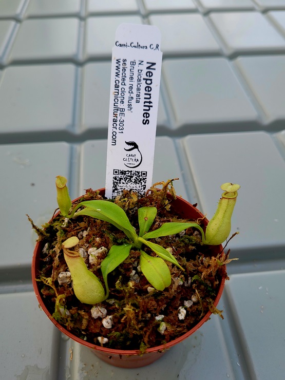 En nuestra opinión, esta es la más distintiva y clásica de todas las especies de las tierras bajas; ninguna otra especie se le acerca. Su hábitat natural son los humeantes bosques de kerangas y los pantanos de turba de Borneo. Es famoso por sus dientes peristomizados, que dan la apariencia de colmillos conectados a la parte posterior de la tapa de la jarra. A veces se puede ver néctar secretado por las puntas de estos colmillos que la planta utiliza para atraer a sus presas nocturnas favoritas: las termitas. Nepenthes bicalcarata es un verdadero habitante de las tierras bajas y aprecia las temperaturas cálidas y la alta humedad continua.